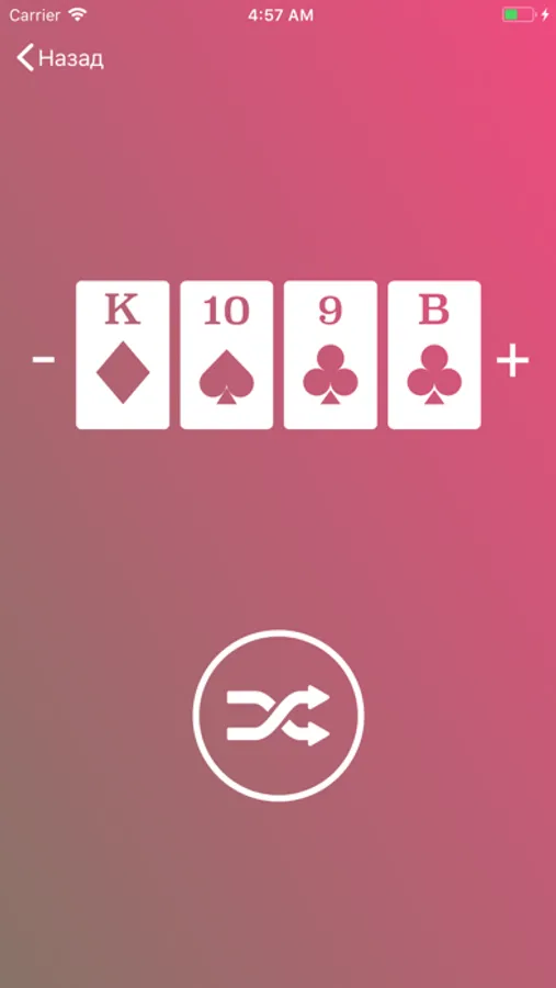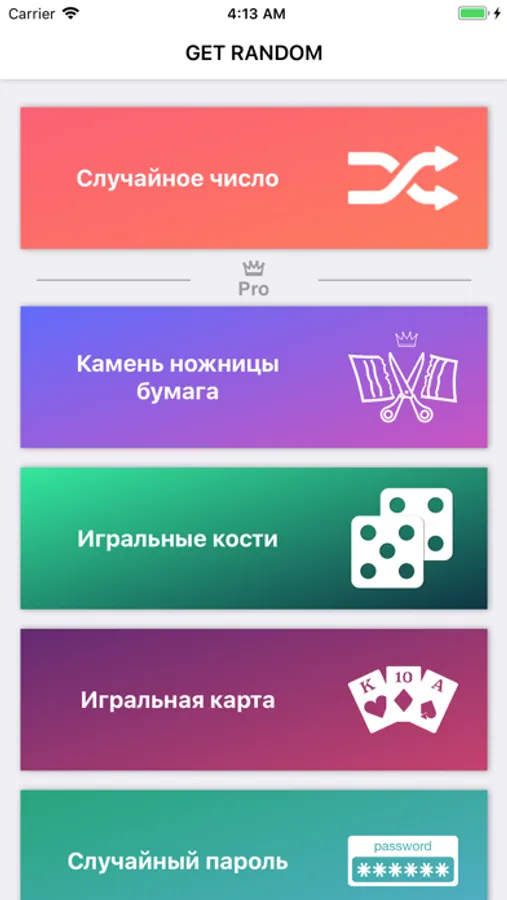 Устали от бесконечных голосов в голове, просящих от вас все время придумывать случайные числа? Не беда! Get Random спешит на помощь! Жмите кнопку, число сгенерируется, и вам больше не придется ломать себе голову мучая случайность. Также, для особо тяжелых случаев есть случайные игровые кости, карты, и многое другое.