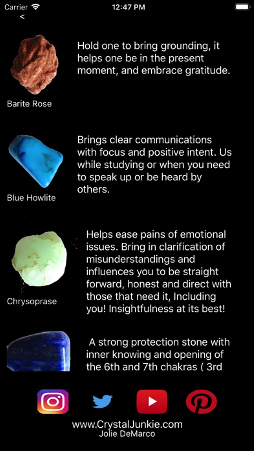 Crystal & Gems can help us receive accurate insight on our lives. A Rock Reading will give you messages to guide & give insight of what is energetically blocking or advancing you! It's fun and enjoyed by all. The 7 Rock Reading was created by a Psychic intuitive Jolie DeMarco aka the Crystal Junkie! Follow her for details on Crystal and gems and how they can change your life! www.Crystaljunkie.com