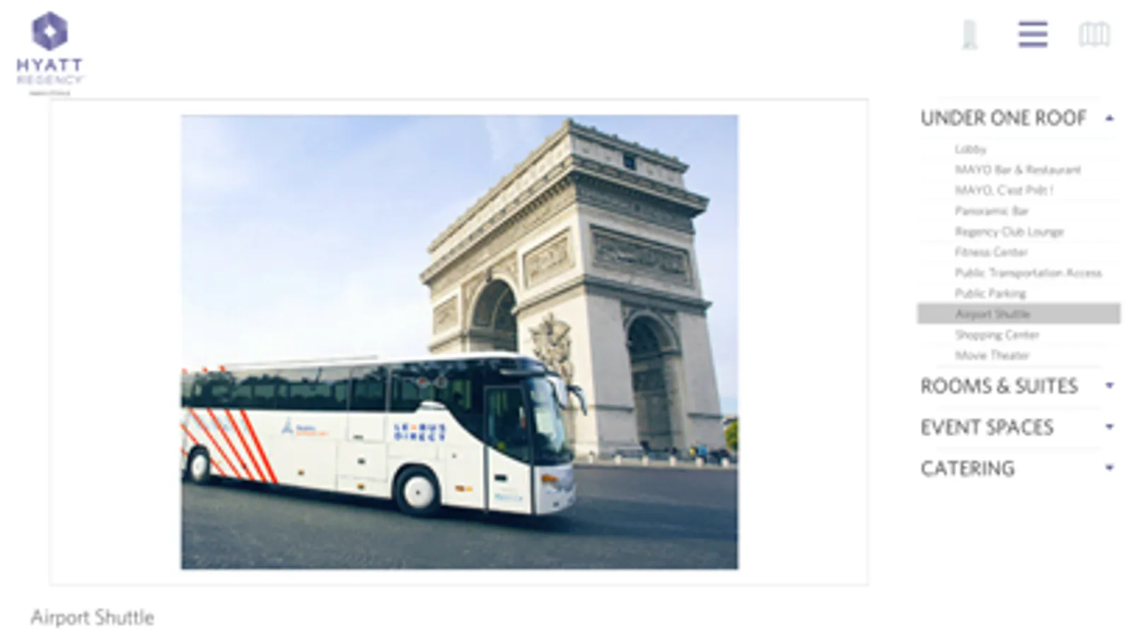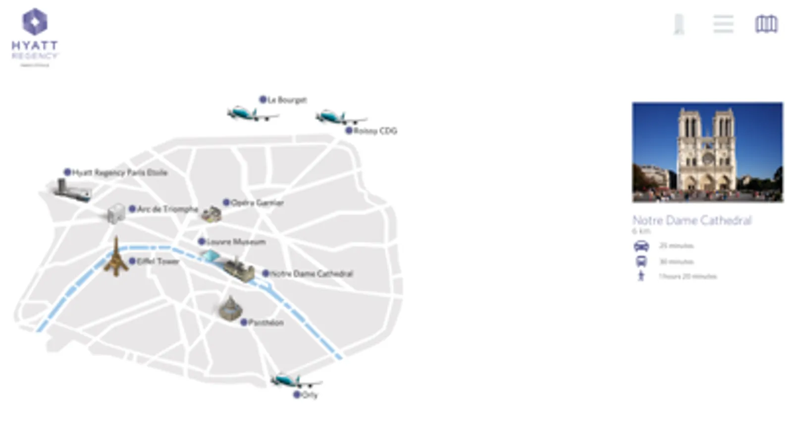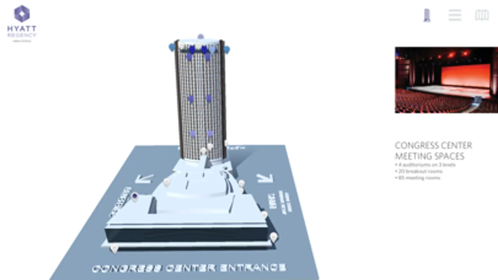 This 3D application is detailing each facility and service provided by the brand new hotel and the adjoining Palais des Congrès.