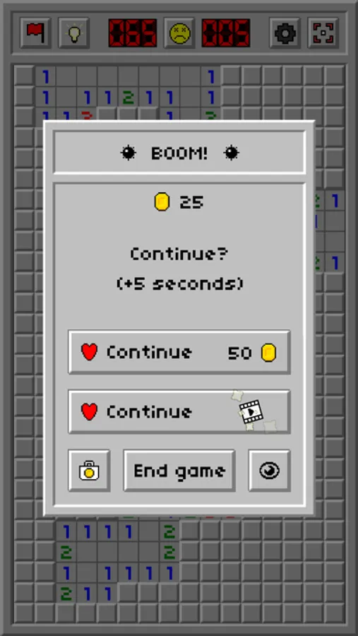 • Continue: If you hit a mine you can continue from where you left off for 50 coins or by watching a video ad