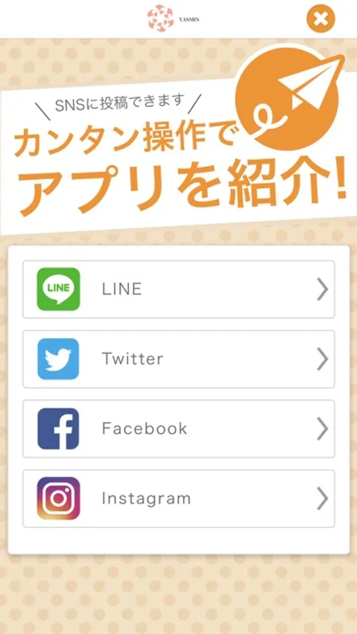 YASMINのアプリをSNSを通じてお友達に紹介する事ができます。