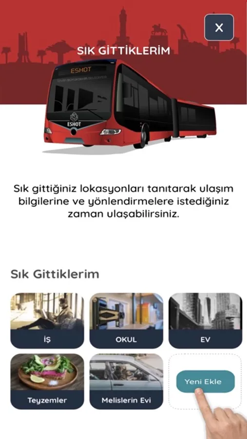 “Adrese yakın duraklar” menüsünde; ilçe, mahalle, sokak numarası ve kapı numarasını girdiğiniz adresin çevresindeki duraklara erişebilir, “Önemli Noktalara Ulaşım” menüsünde İzmir’de bulunan eğitim, konaklama, sağlık gibi kategorilerde bir çok noktaya ulaşım imkanı sağlayabilirsiniz.
