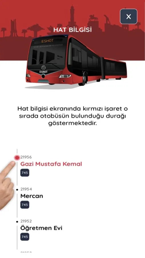 Uygulama içerisinde bulunan “Arama” ekranı ile otobüs hat ve duraklara erişebilir, seçtiğiniz otobüs hattına ait durakları, otobüslerin anlık olarak hangi durakta olduğunu görebilirsiniz. Durak seçimini yaptığınızda durağa anlık olarak yaklaşmakta olan otobüsler ve duraktan geçen hatları listeleyebilirsiniz.