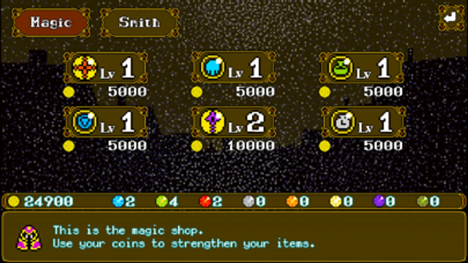 •Items you pick up along your adventure can be upgraded in the magic shop.