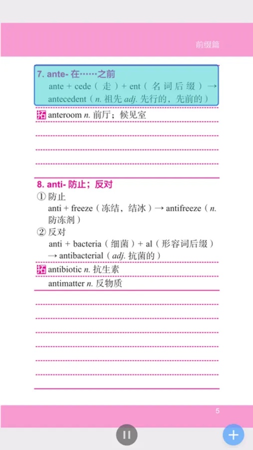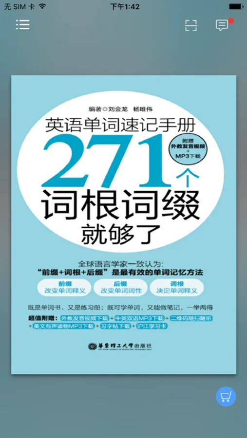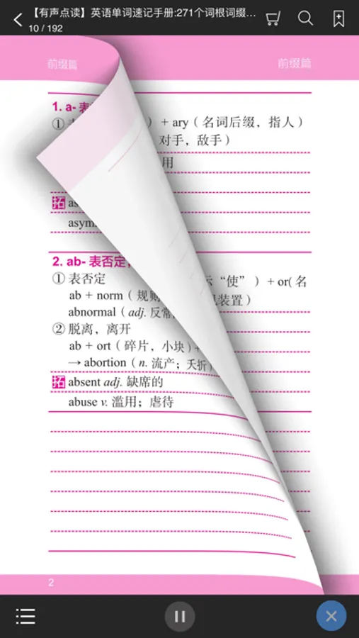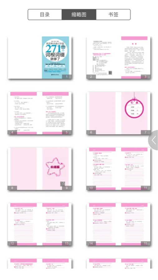 本应用通过对常用前缀、后缀和词根的分析,帮助读者掌握构词法,做到触类旁通,举一反三。应用中包括200个常用词根和50个常用词缀,每个词根、词缀都提供最具有代表性的单词供读者学习使用,口袋装随身带,供读者利用碎片化时间学习记忆单词。用户可通过本应用,可利用零碎时间记忆词汇,从而达到在掌握核心词汇的基础上迅速扩充词汇量的目的。全书采用地道美式发音,具有点读和连读两种模式。
