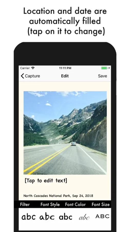 You can change the font style, font color, alignment, transparency (alpha) of your text. You can also tap and hold to put the text anywhere on the photo.
