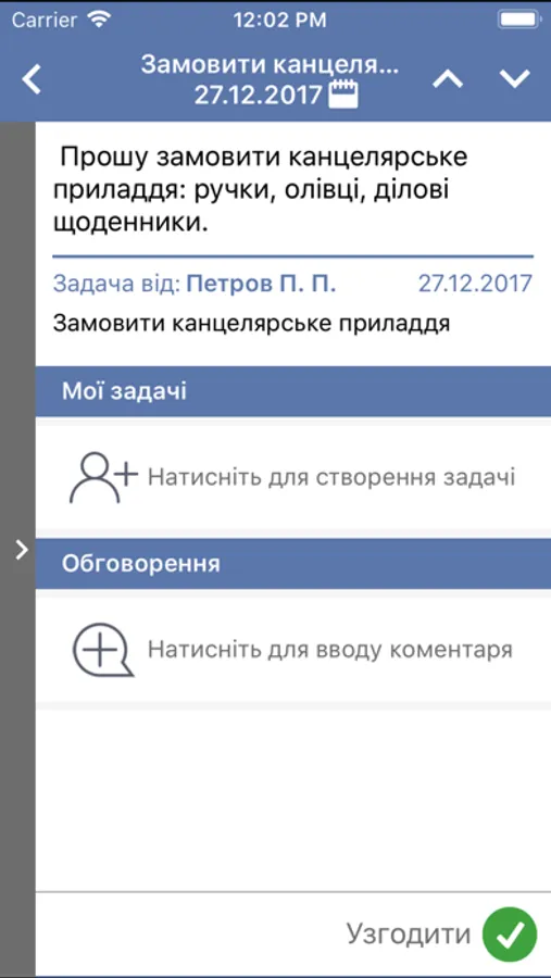 Приложение позволяет работать над задачами совместно, обсуждать, делегировать задания, уточнять позиции перед согласованием. Непосредственно в приложении можно добавлять, удалять, просматривать вложения (сканы документов, таблицы с расчетами, любые тексты, фото и т.п.).