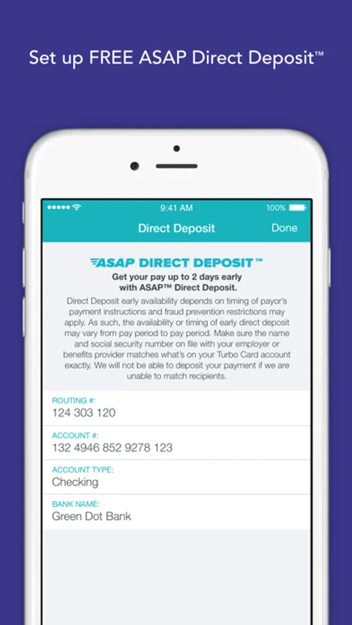 **Direct Deposit early availability depends on timing of payor’s payment instructions and fraud prevention restrictions may apply. As such, the availability or timing of early direct deposit may vary from pay period to pay period. Make sure the name and social security number on file with your employer or benefits provider matches what’s on your Green Dot account exactly. We will not be able to deposit your payment if we are unable to match recipients.