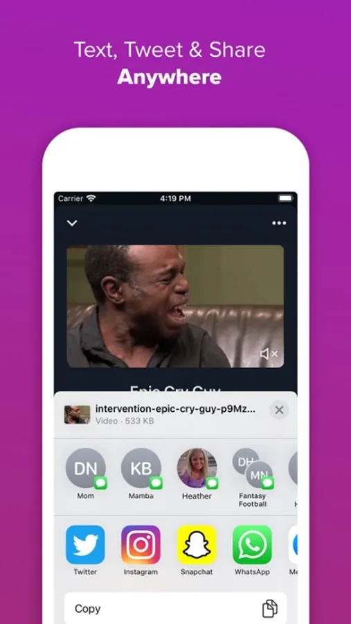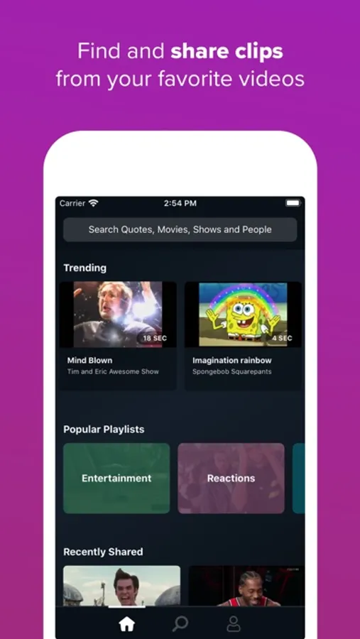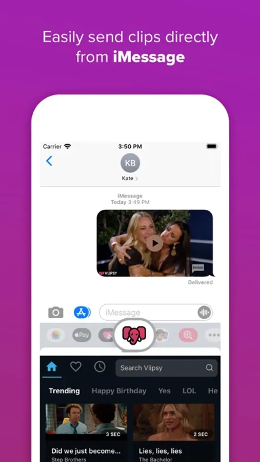 • Search the best video clip library. Find all your favorite moments from film, television, celebrities, sports, or internet culture at the exact moment they fit in your conversations.