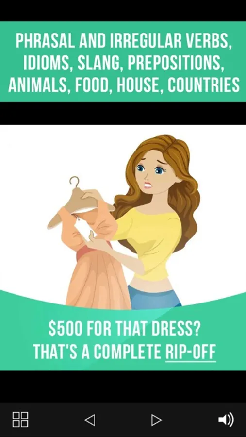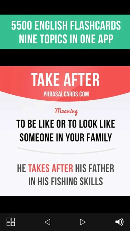 Learn English in a fun and easy way! In this app you will find 5500 flashcards on 9 topics: phrasal verbs, irregular verbs, idioms, slang, prepositions, animals, food, house, countries.