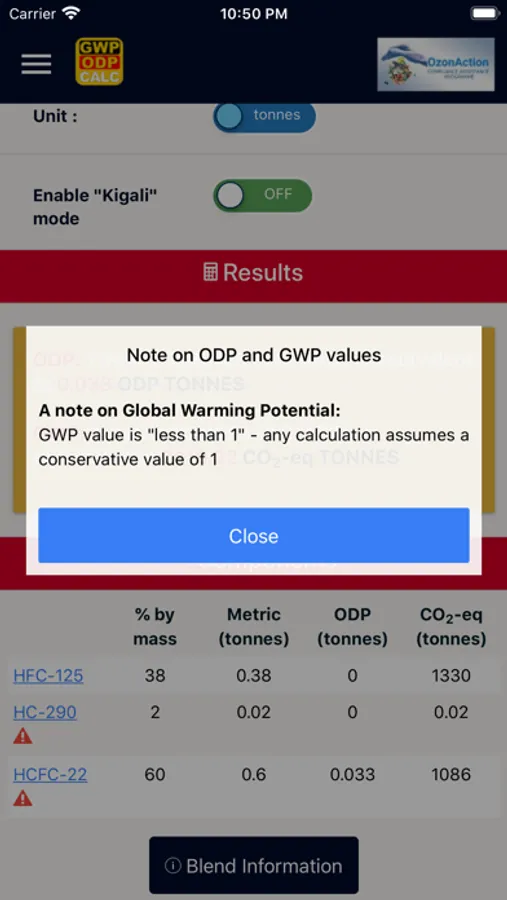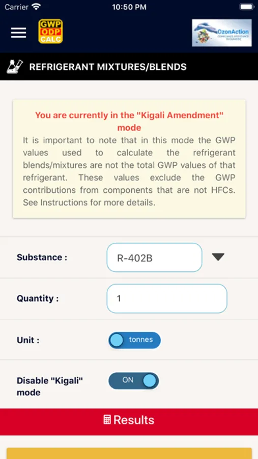 For refrigerant mixtures/blends, simply select the name of the blend and enter the quantity. The calculator will display the corresponding total ODP tonnes and CO2- equivalent tonnes for that quantity of substance. The components of the mixture and their relative proportions (metric, ODP, CO2- equivalent) are also displayed. Both these types of calculations can be carried out in both the "Actual Values" mode and the "Kigali Amendment" mode.