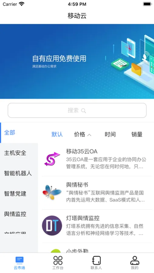1、可通过移动云市场选购符合企业自身需求的办公、生产管理、营销管理等应用,降低企业运营成本,提高办公效率。