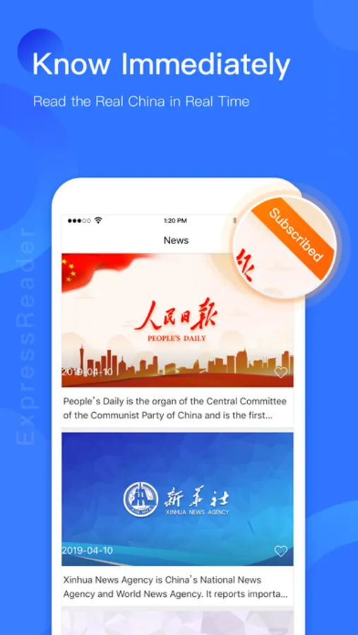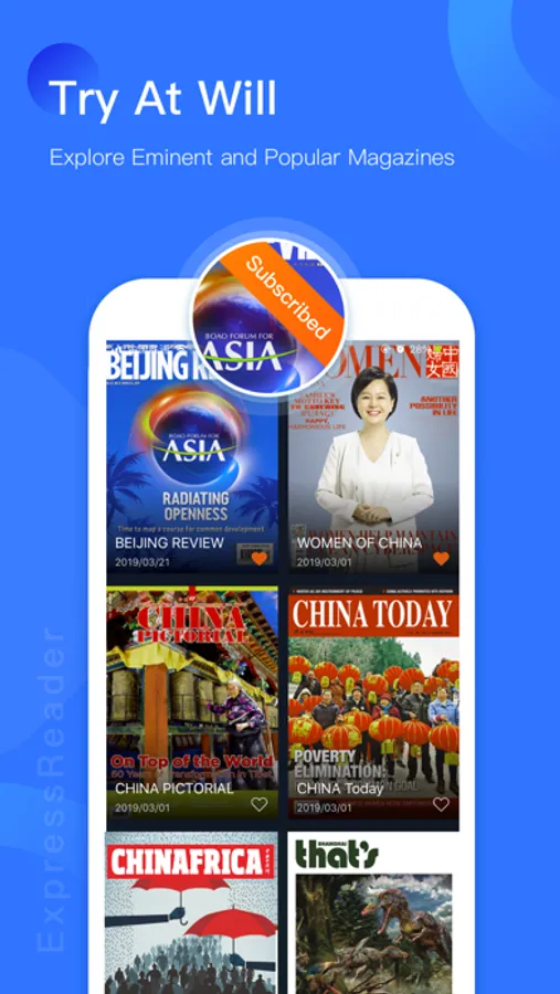 ExpressReader is an app designed for oversea users to access real-time, comprehensive and authentic news about China. We gather supreme content from authoritative news outlets and mainstream magazines to let the world read and understand China precisely and effortlessly.