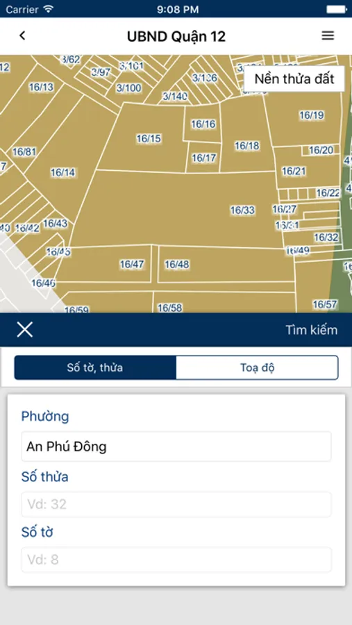 + Tìm kiếm thông tin thửa đất theo Số tờ, số thửa hoặc theo Toạ độ.