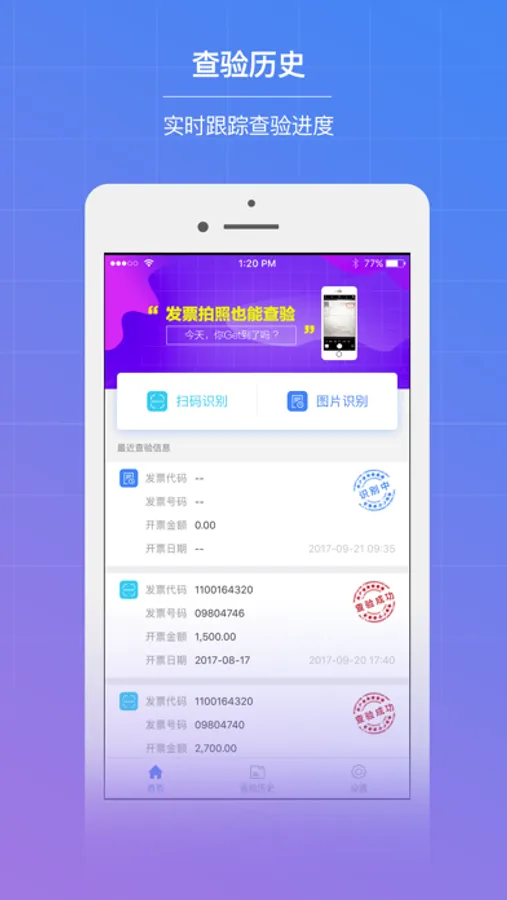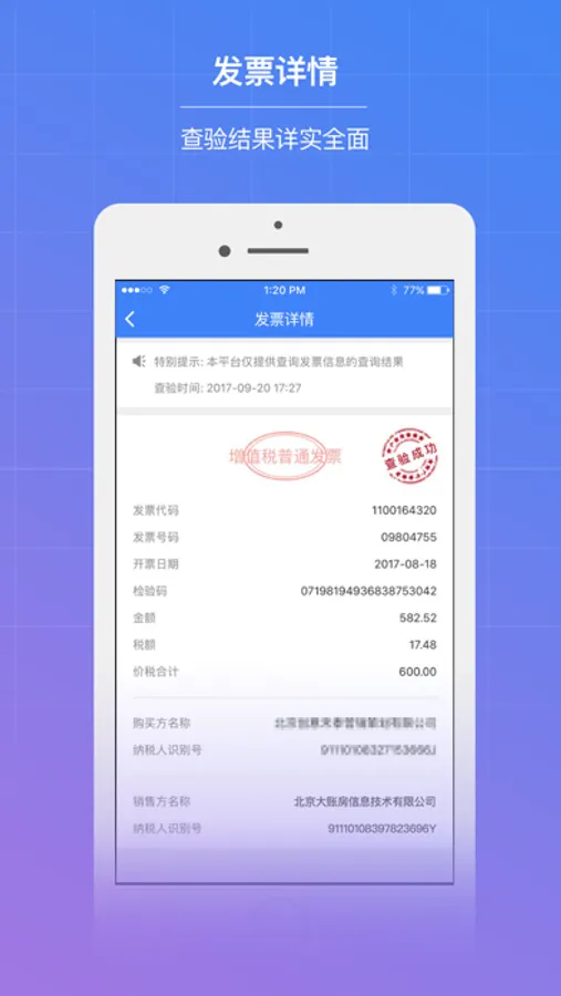 【查验历史】:实时跟踪查验结果,查看发票全票面信息。