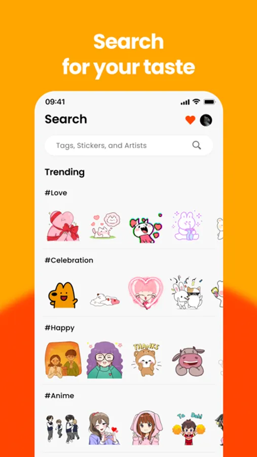 Search for any emotions, situations, or artists and save them to your sticker list.