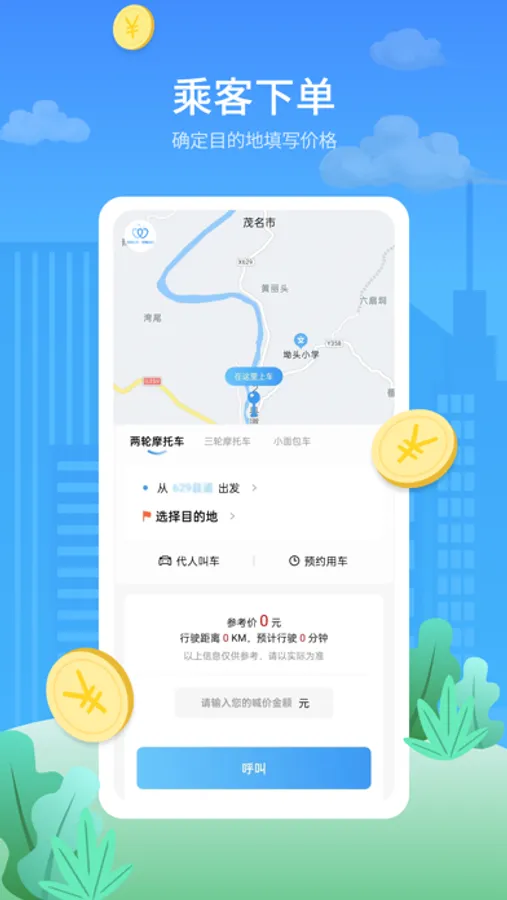 (1)下单叫车:可根据需求选择二轮摩托车、三轮摩托车、小车,根据行驶里程及用途进行计价;