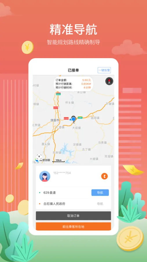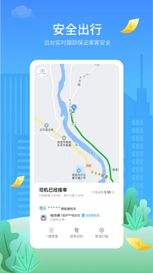 (4)实时跟踪订单,一键报警功能,保证乘客出行安全。