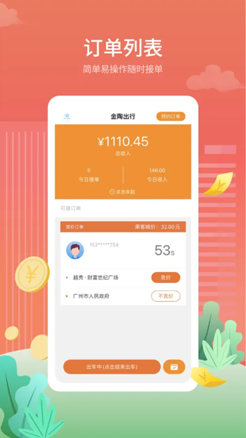 “金陶出行”乘客端是一款根据用户需求用车出行且有较高便利性的系统,司机端是便于金陶出行车主接单的智能系统。