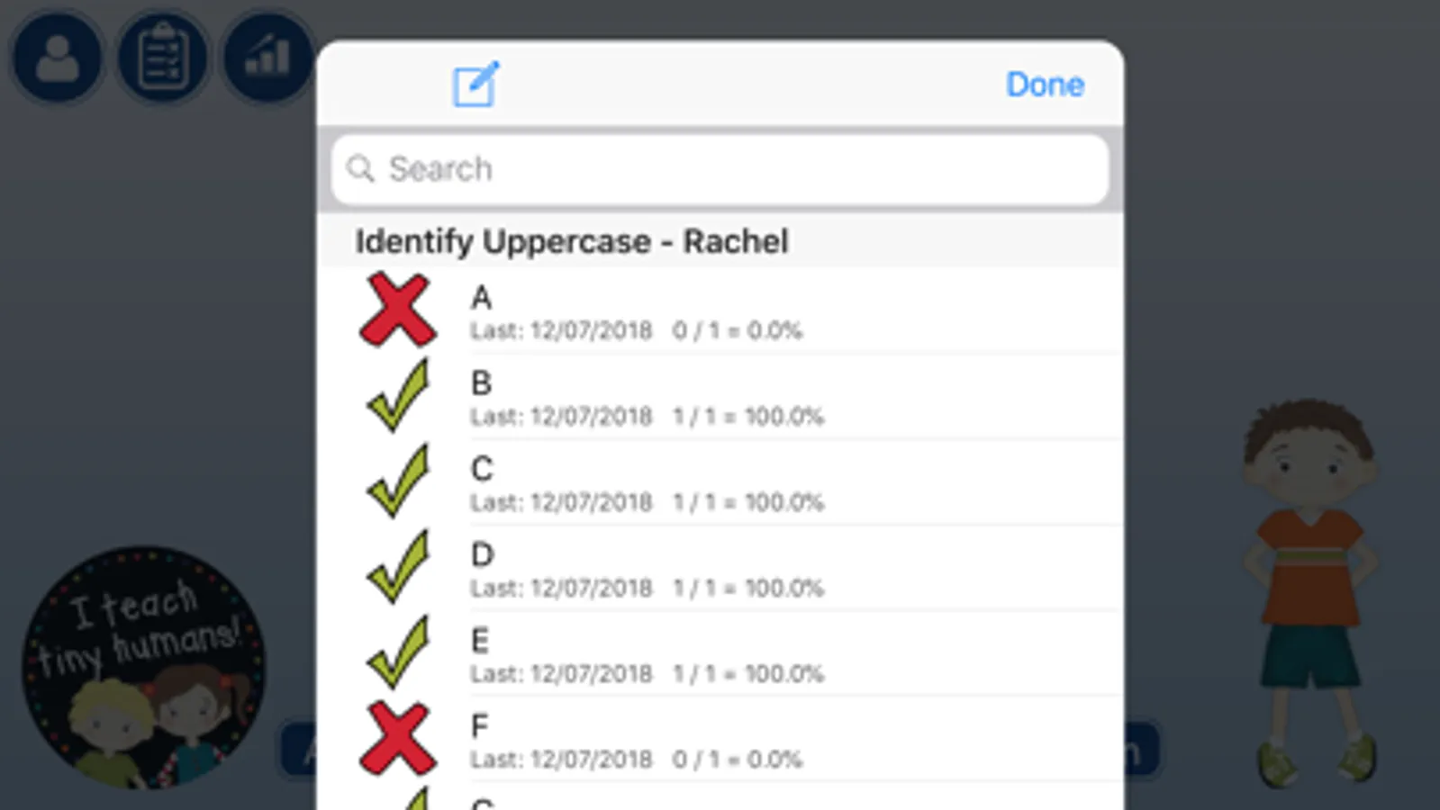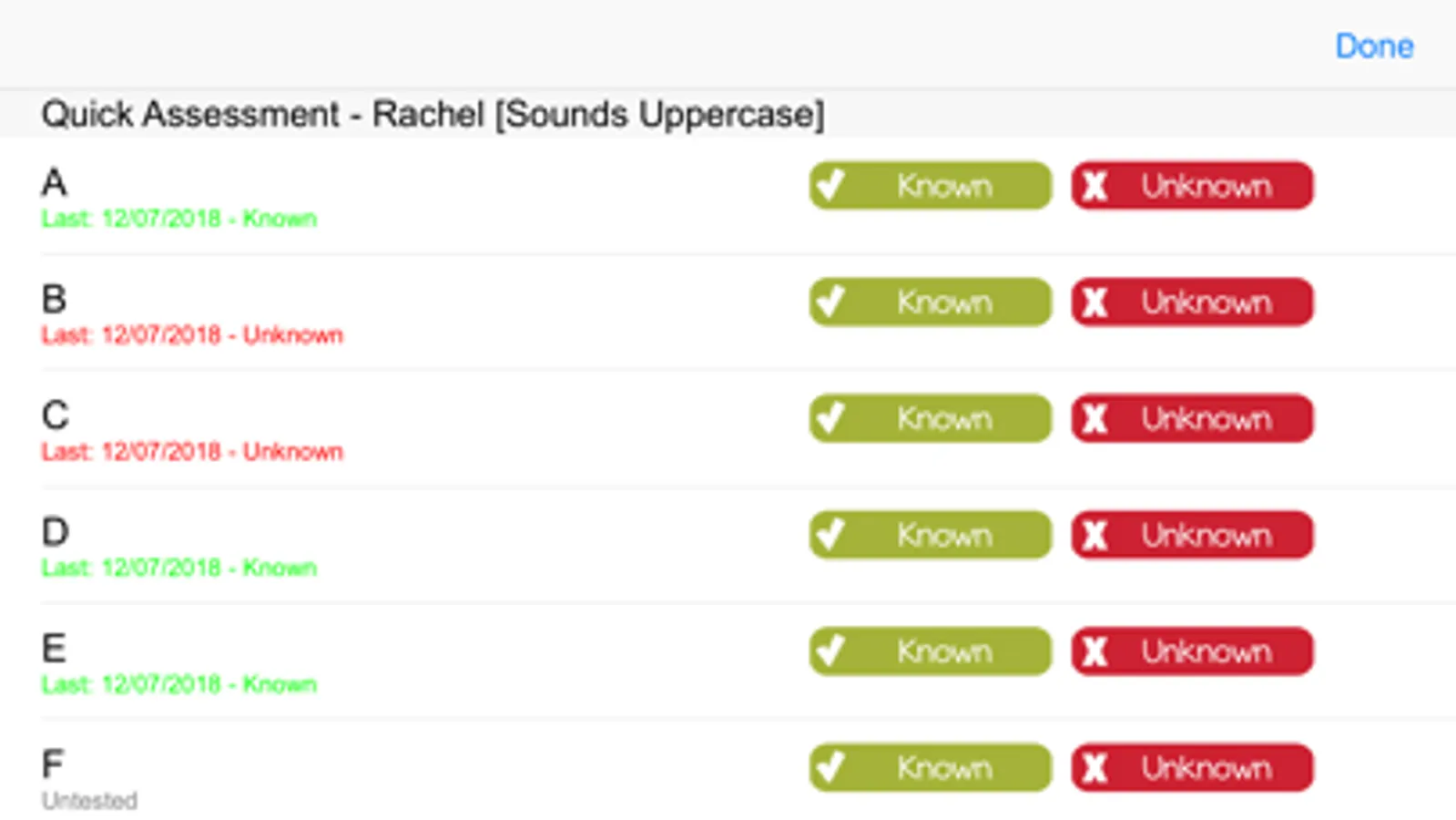 For each interaction in assessments or interventions, the facilitator records whether the student knows the letter/sound or not. The application tracks each and every assessment, automatically recording proficiency when the student reaches 80% for the letter or sound or marking as unknown if proficiency drops below the 80% threshold.