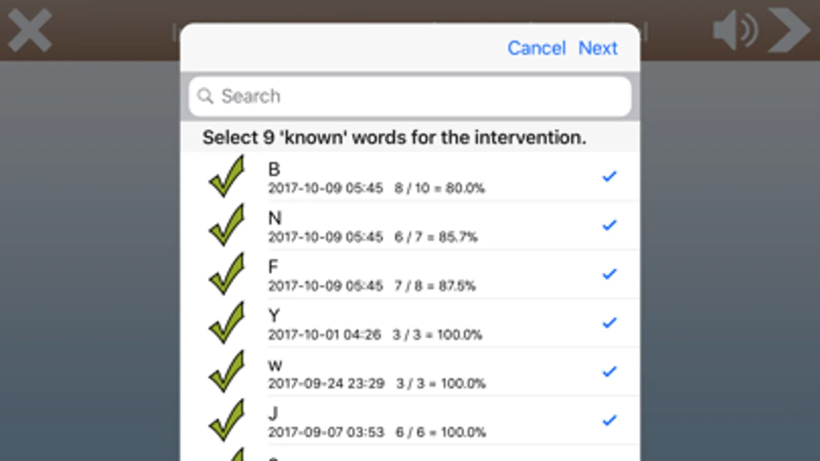 This application guides you through interventions by presenting letters or sounds in the following order, where Z is unknown and A through I are known by the student:
