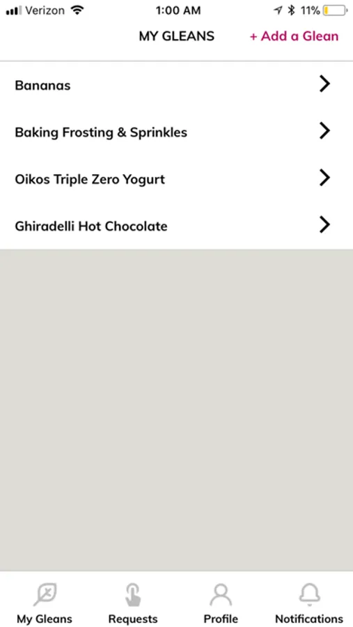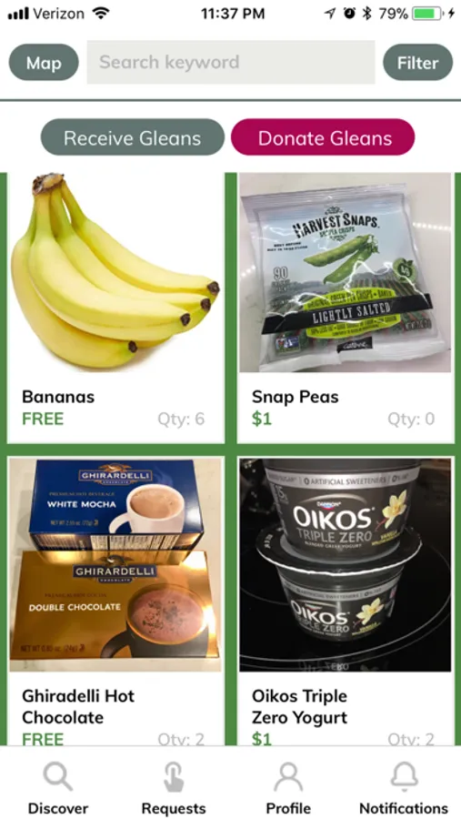 To give away free food, users simply post their food item as a "Glean" in the app and are notified once another user requests their item. Both individuals are given the others' contact information to establish pick up locations and times.