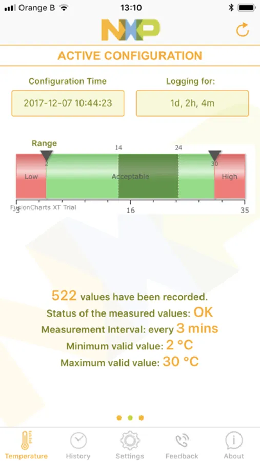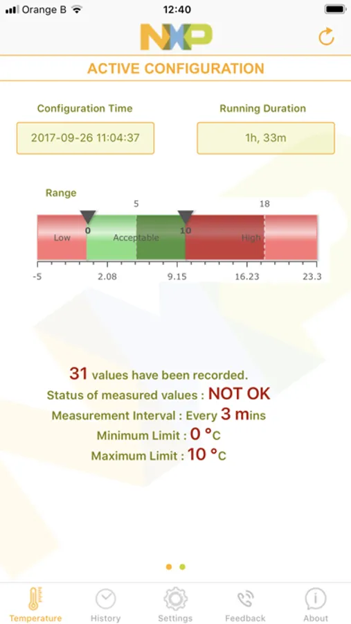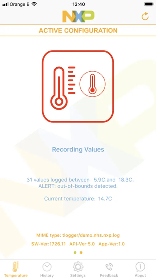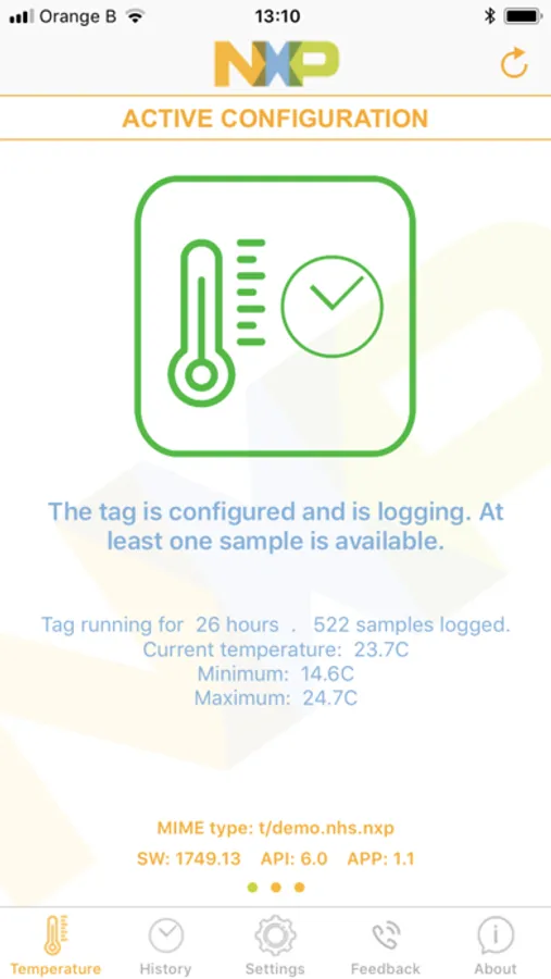This APP interacts with the NXP's NHS3100 IC, optimized for temperature monitoring and logging. The temperature sensor offers an absolute accuracy of 0.3C. Each chip comes pre-calibrated and NXP provides a certificate with NIST traceability, easing the use of this IC for medical and pharmaceutical applications.