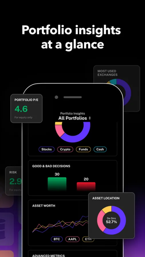 ▸ Portfolio Insights - Access all features and gain valuable insights into your investments. Modules include portfolio performance, portfolio diversity, good & bad investment decisions, most used exchanges, asset allocation, asset worth, portfolio P/E, risk level, and so much more.