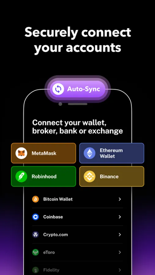 ▸ Auto-Syncing with your wallets, brokers, exchanges, or banks