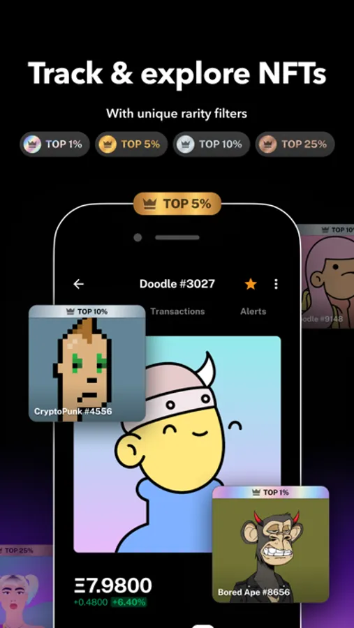Explore, manage and easily track all Ethereum or Polygon blockchain NFTs in your portfolio. Automatically connect your wallet like MetaMask, Walletconnect, and more. We implemented rarity filters to find a rare gem with a simple tap.