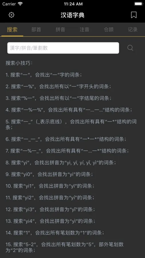 14. 搜索“1”,会找出所有笔划数为“1”的词条;