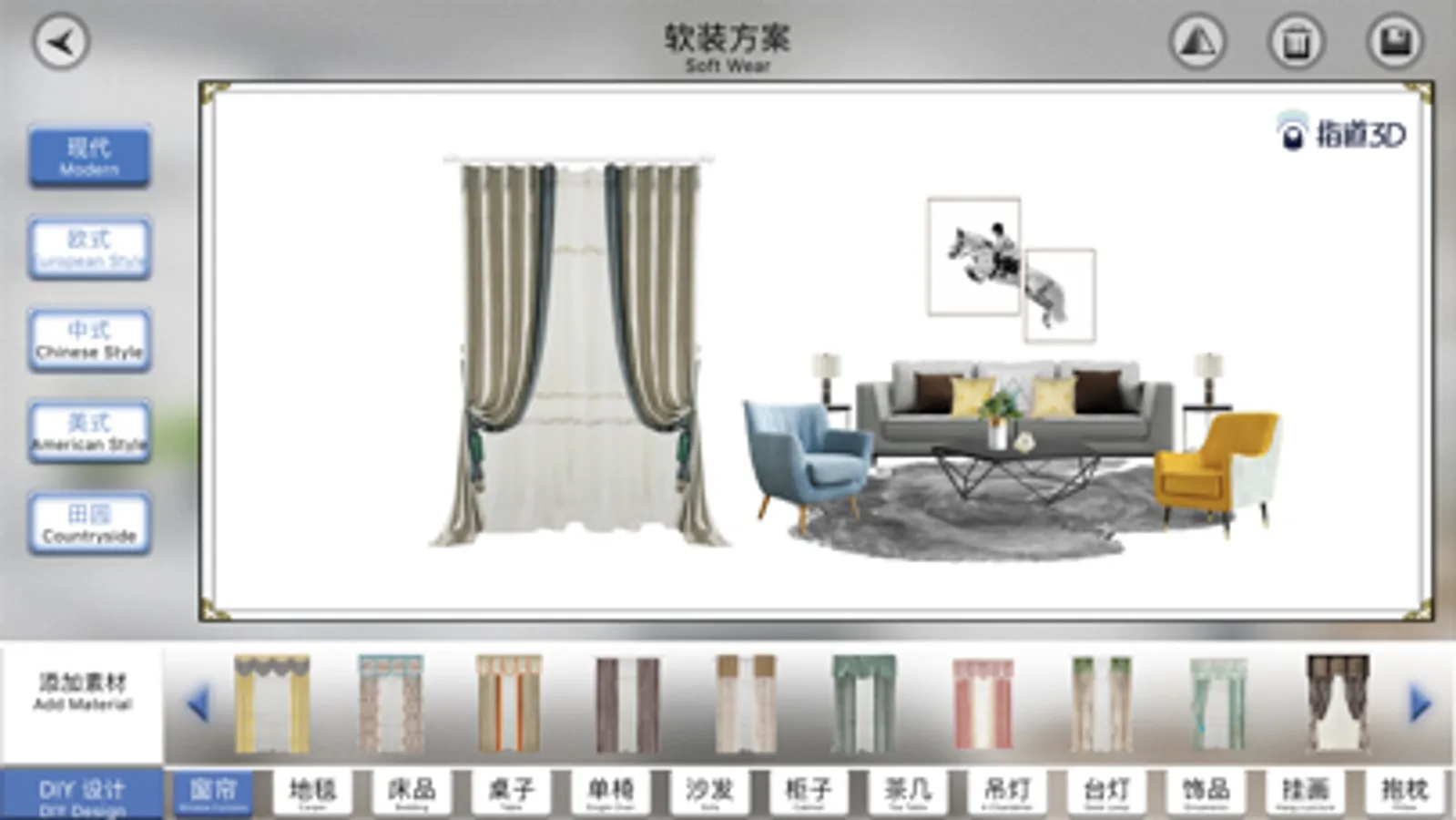 效果设计,触手可及!指道3D是软装行业最好用的搭配神器。在这里您只需要和客户谈单,我们为您提供上万种时下最热销的窗帘款式供您选择,让您享受到最专业的定制服务!
