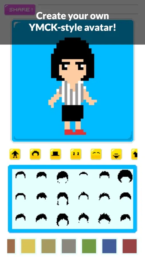 You can create your own pixel art avatar in YMCK style, just by choosing each body parts and clothing.