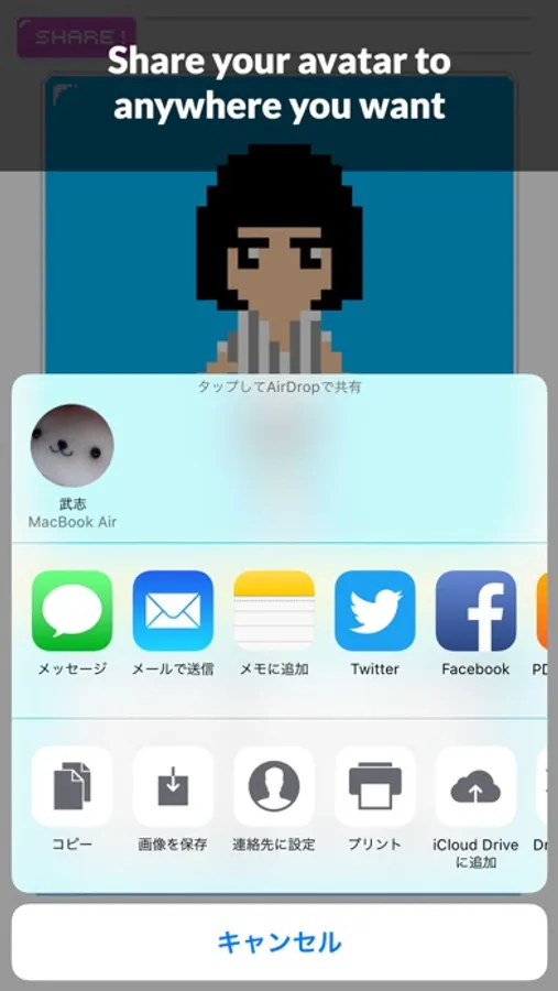 Your avatar can be saved to your Camera Roll or can be shared to any SNS. Of course this is a best choice to use it as your profile photo!