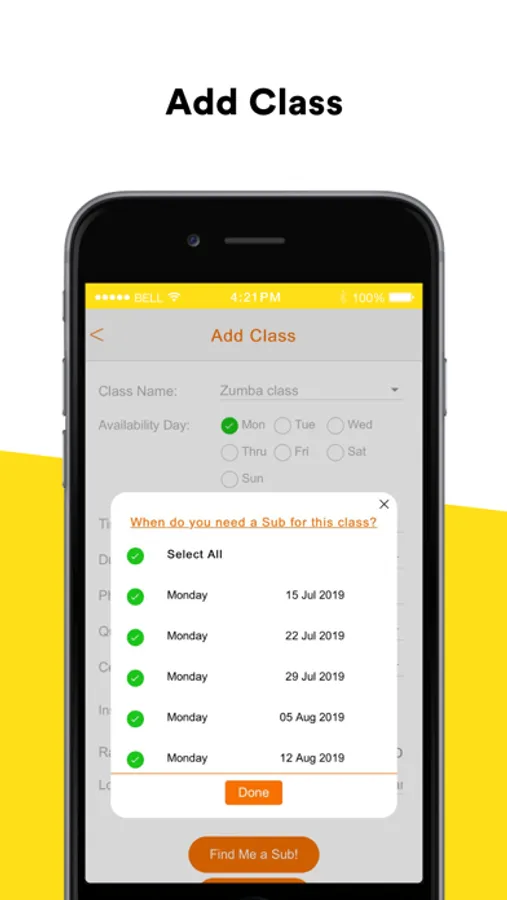Easily add all your classes to your profile, then when you need a sub - jump back in and tap on the date you need a cover for!