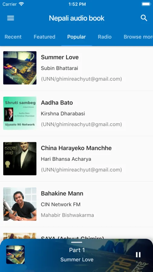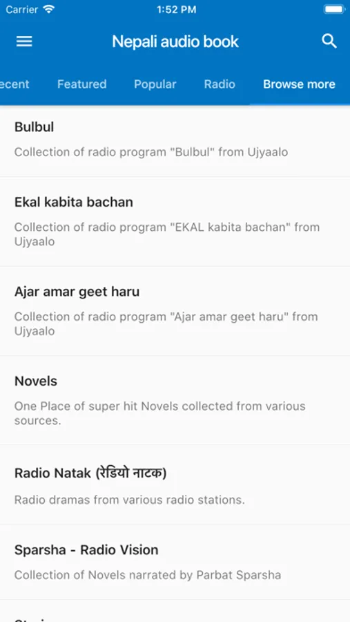 No more hassle to download. Use this application and enjoy your favourite Nepali radio programs online. Nepali Audio Book is the collection of recorded radio programs which are broadcasted from different radio channels in Nepal. Most of the collections are from Ujyaalo 90 Network. You can enjoy listening Nepali novels, stories, poems, comedy and many more.