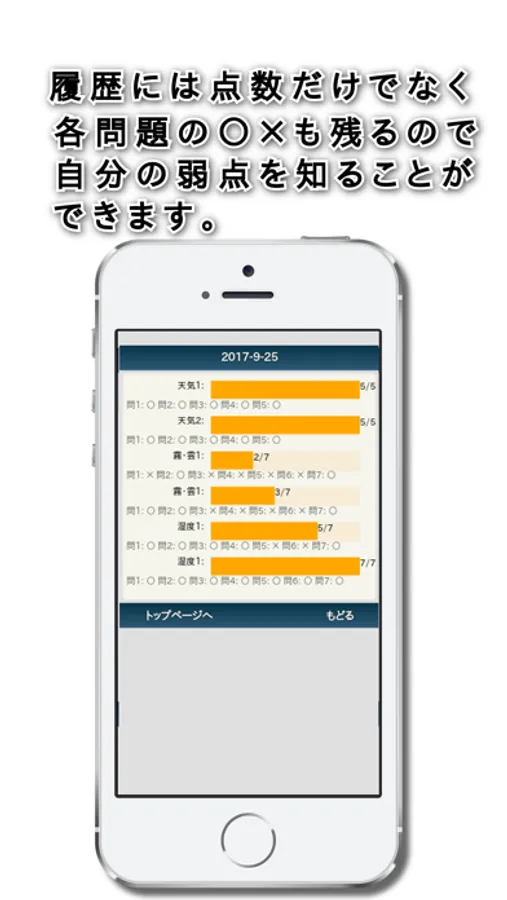また、履歴では各問題の○×と点数が記録されているので苦手、弱点の発見に役立ちます。