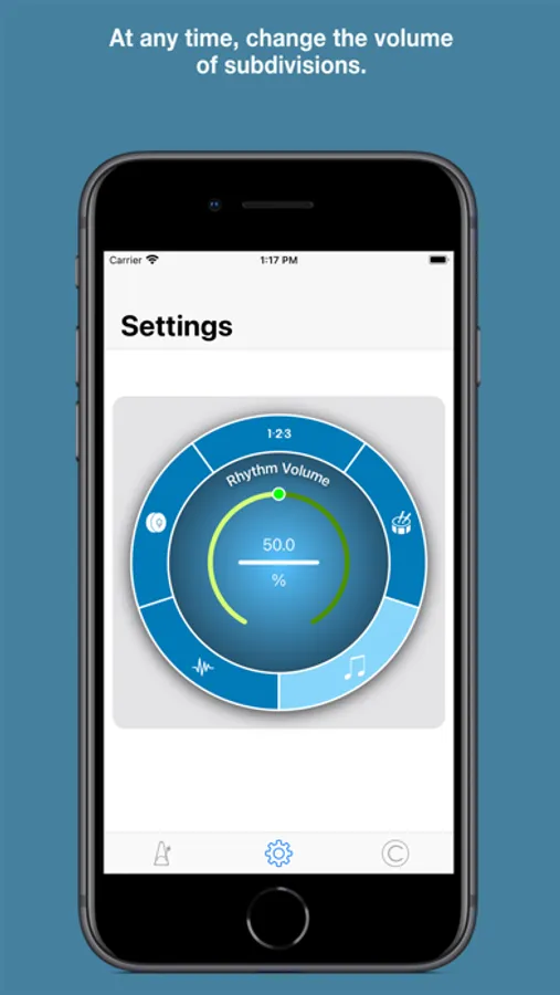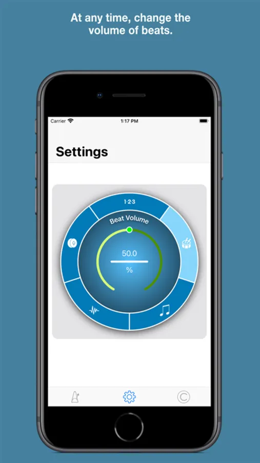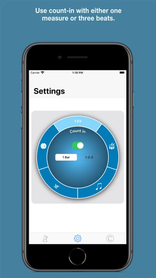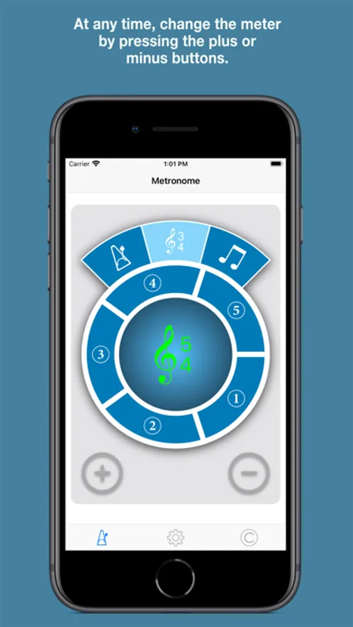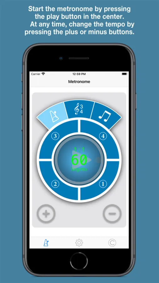 To get started, press the play button of the metronome in the center and the metronome starts playing using its current settings.