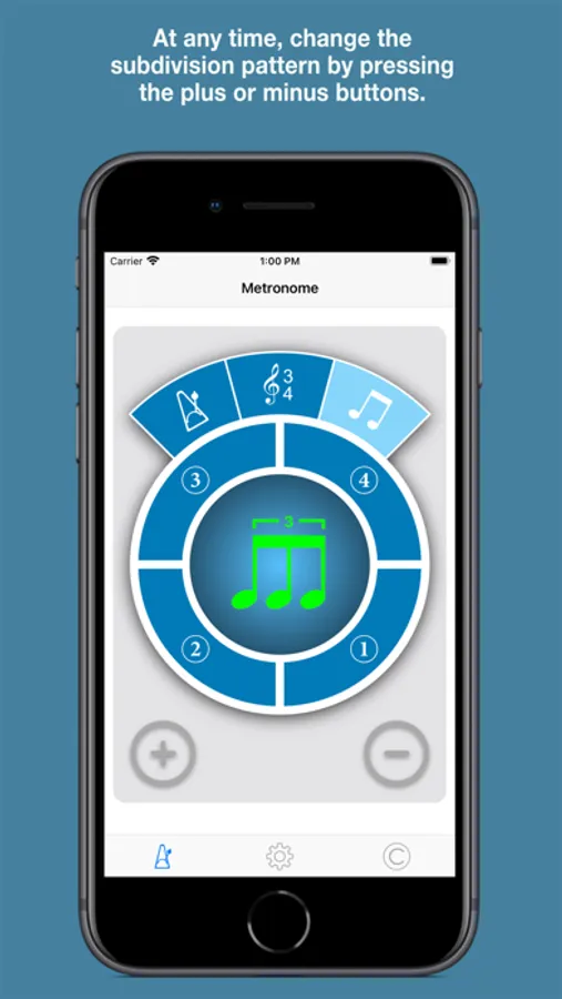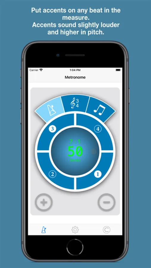 At any time you can adjust beat, meter, rhythmic pattern by pressing the plus or minus buttons, or accentuate any beat in the meter by long pressing the beat number.