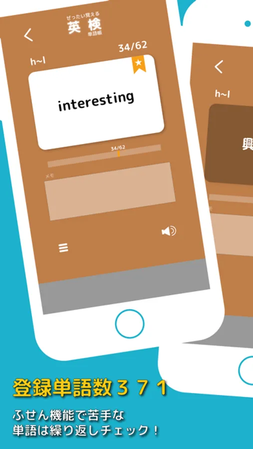 371個の英単語をフォルダでまとめてあるので、少しずつ、確実に単語を覚えることができます。覚えられない単語には付箋をつけて、苦手な単語のみを集中して復習することもできるので、とっても便利。シャッフル機能も使えば、より確実に単語を覚えることができます。