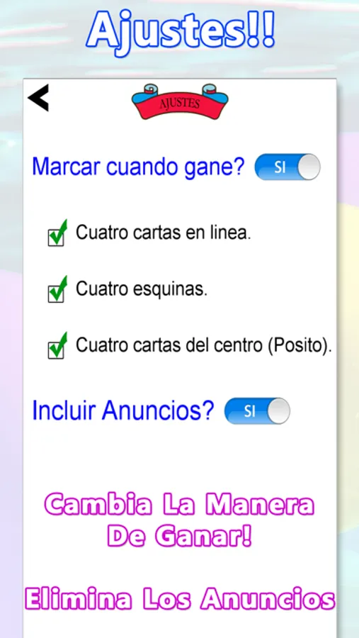Cambia la configuración de ganada para mostrar diferentes tipos de victorias. Filas, columnas, cuatro esquinas, cuadros del medio, o ninguno en absoluto, ¡es toda tu opción! Tú decides cómo ganar!