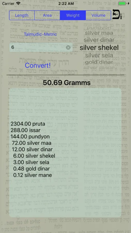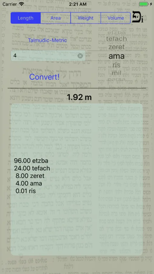 Easy-to-use app for converting Talmudic/Biblical measurements to metric and vice versa.