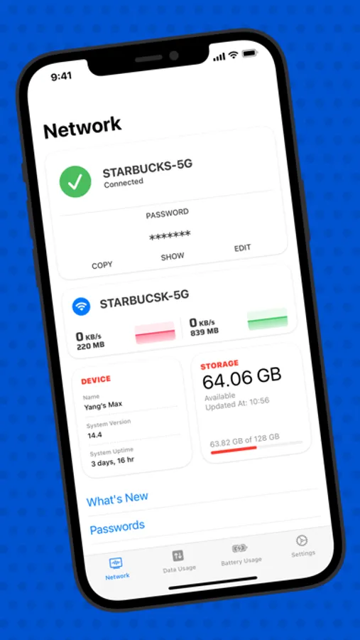 See real-time network speeds and status, save your WiFi passwords in one safe place, check your iPhone/iPad Battery Health?