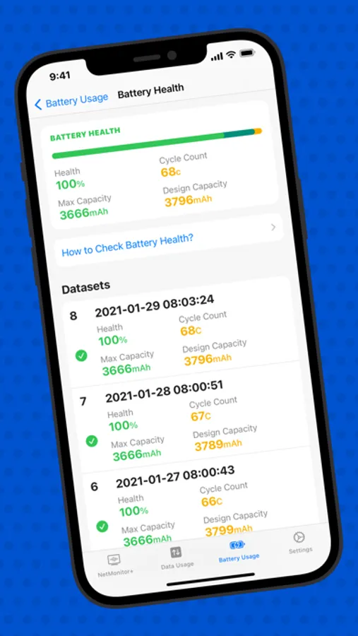 • Check your iPhone/iPad battery health, including maximum capacity, cycle count, capacities and log those informations time to time so you can keep tracking it.