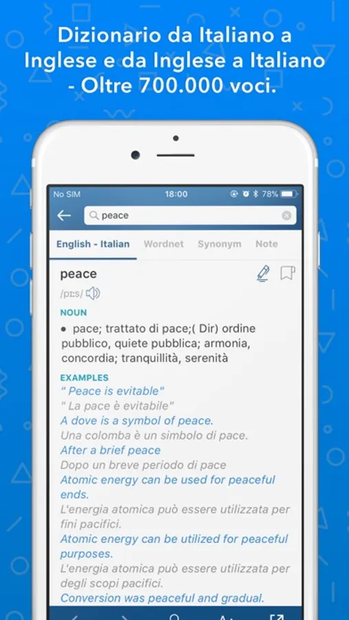 Dizionario bilingue per studenti, insegnanti e turisti, traduce parole e frasi da inglese a italiano e da italiano a inglese. Oltre 400.000 parole inglesi e 300.000 parole italiano in un dizionario offline, con pronuncia offline. Porta sempre con te dei riferimenti affidabili in italiano e in inglese con il dizionario italiano-inglese.