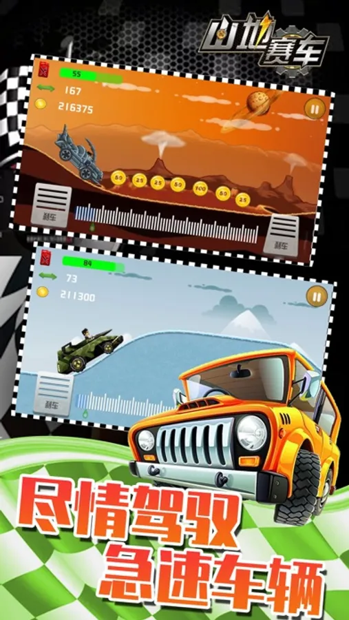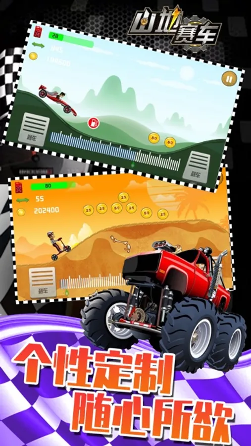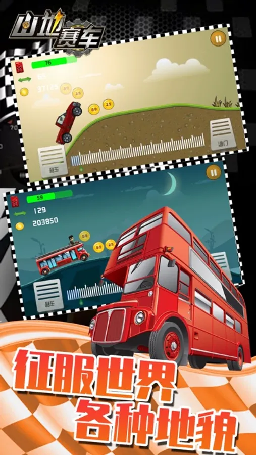 - 不同的爬坡环境(农村、沙漠、过山车和月球等等)。