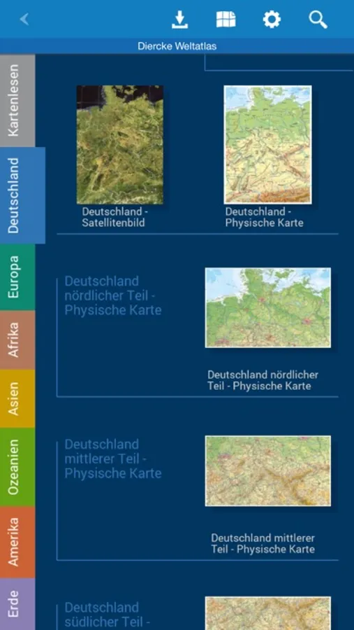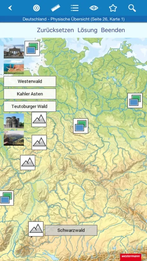 Für physische Karten (Beispielkarte „Deutschland – physische Übersicht") gibt es ein Quizspiel, in dem Orte und andere Einträge auf der Karte an die richtige Stelle in der Karte zugeordnet werden müssen.