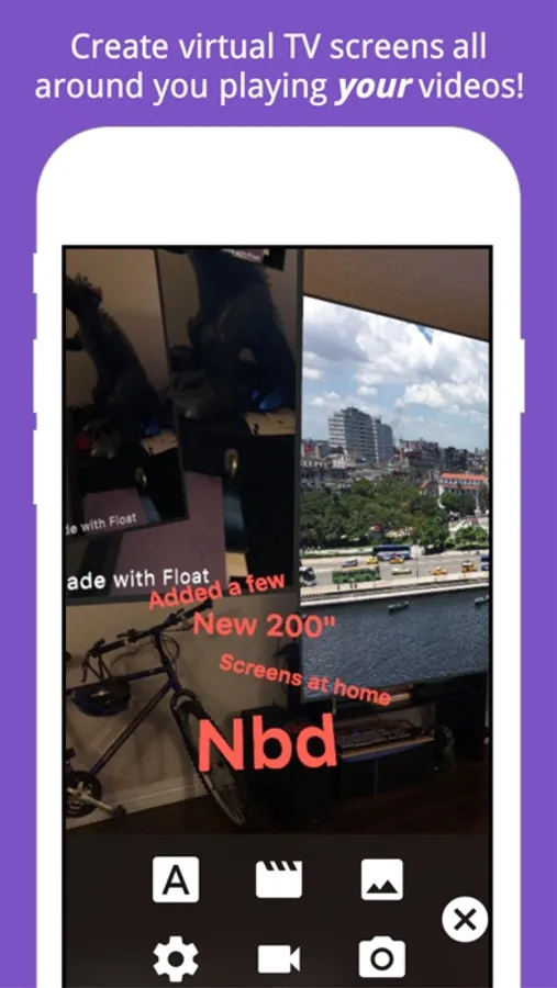 Remix the world around you with Float Camera! Place your videos and photos floating in the real world. Caption the world in real-time. Carefully position photogrids and comparison videos as you create new art. Make your videos huge, surround yourself with old memories, and capture a funny thought right now!