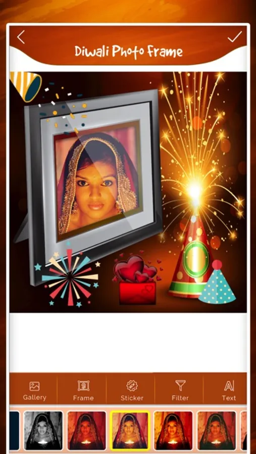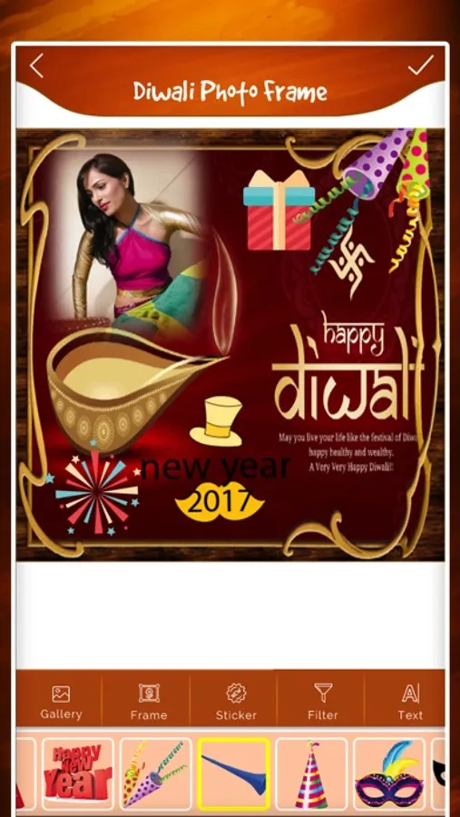 - Add a text to your photo, and decorate the Diwali Photo Frame with some amazing stickers.