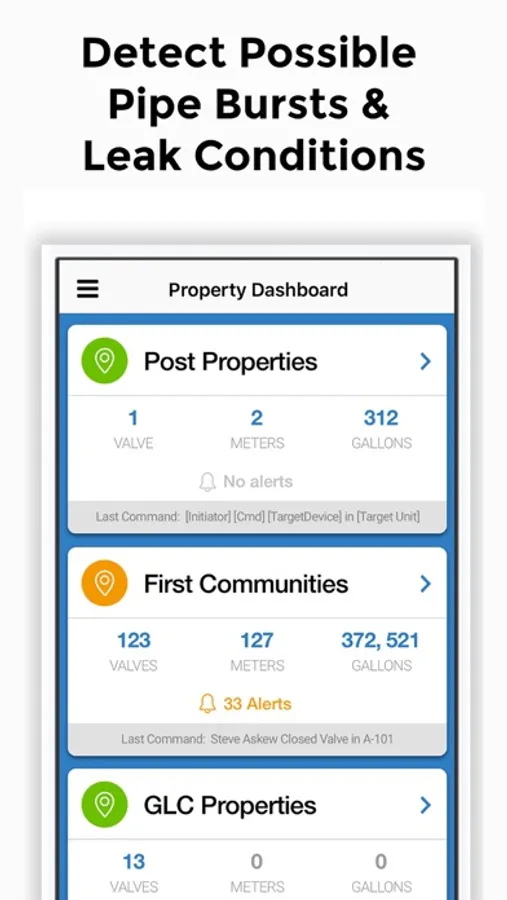 In addition, by monitoring the meter and optional 3rd party wireless leak detectors, the platform can catch potential water Leaks and catastrophic pipe Bursts, notify you immediately, and automatically shut the water off in seconds. This prevents further damage to the property, saving owners money in repairs and insurance claims, and keeping residents happy.
